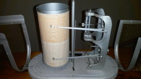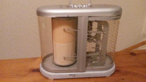 Nachdem ich das Gerät aufgezogen habe, läuft der Wochenzyklus. Faserschreiber und Diagrammpapier konnte ich beim Hersteller Fischer in Drebach bestellen. Die Reproduktion der Hydrohaare ist noch nicht ausreichend, aber bei der Benutzung im Freien steigt die Luftfeuchtigkeit auf bis zu 100 %. Dadurch reproduzieren sich die Messhaare von selbst.